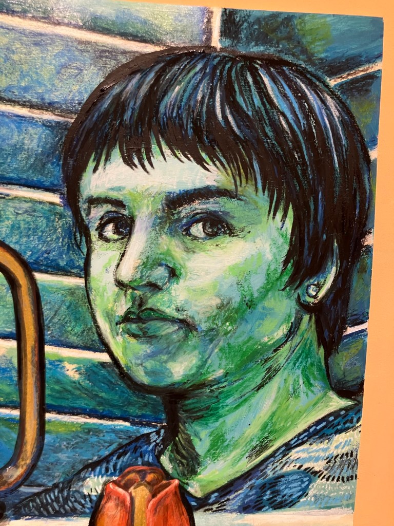 Back in my shed, in my happy place. I haven’t painted my portrait since I was 19- that’s 20 years ago. I wanted the composition to a bit weird a bit out there. I was happy with the big loose brush strokes and just getting stuck in. I spent a good deal on the drawing beforehand, drawing just myself in my sketchbook. I did the background thinking ‘Oh I’ll just get this done out of the way but with my limited palette I love it. It’s chunky and blocky now but I actually like the tones and the forms that have emerged. I turned it upside down to break down what ‘should’ be there and what I actually see. I forgot how much it’s an internal dialogue while painting. I did a little journaling beforehand just to clear the head because you draw with the mind not with the hand. Will try and plan and draw another portrait in front of the tv while my daughter sleeps again tonight. But yeah, progress all good. Can’t wait to go over it in prisma colour pencils and oil pastels.
