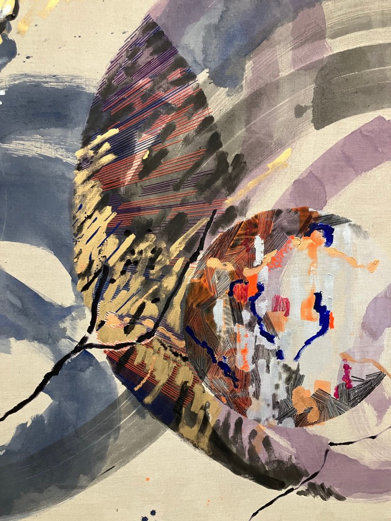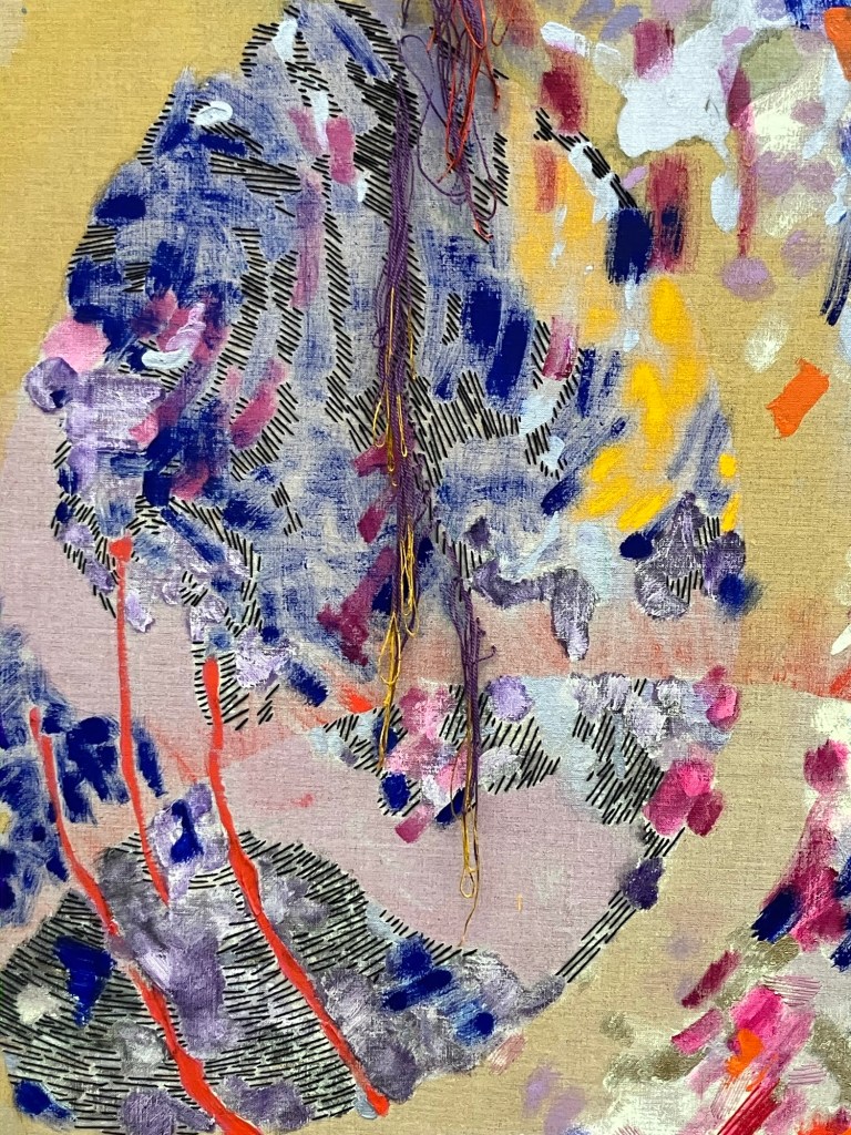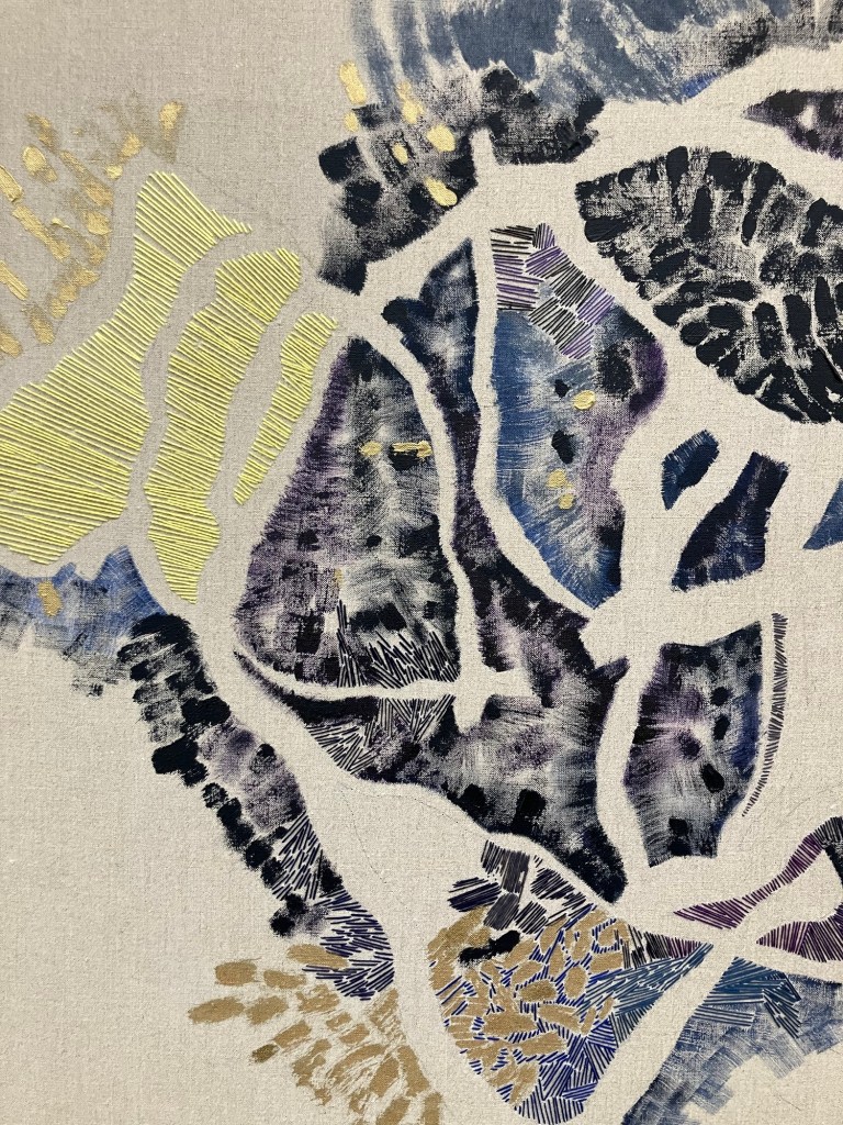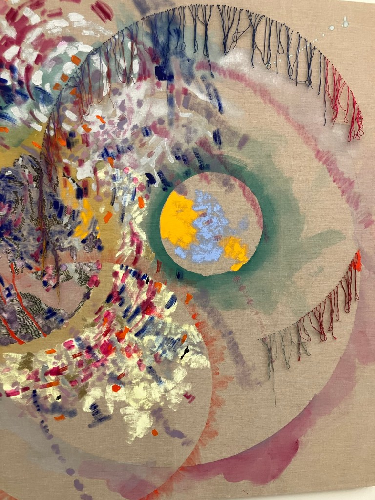 The silver and blue threads inside the circle remind me of Van Goghs starry night Bright bold and neon colours were dotted in segments I could imagine applying these similar techniques into a portrait I’m currently painting Loved the vivid lemon yellow hurtling through space