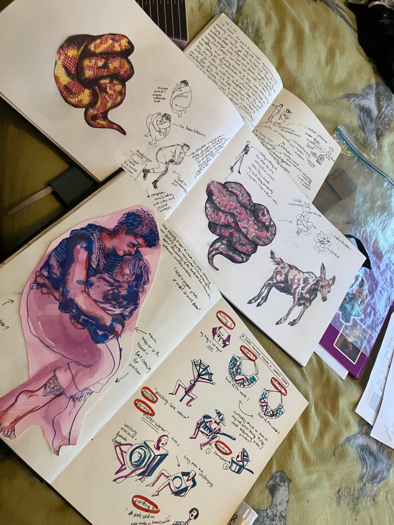I adore the intimacy of sketchbooks. I love the potential, the planning, the mishaps and the madness all contained within the pages. These pages reflect the visual juxtaposition of woman and vessel- both functional both useful. I enjoy the illicit pleasure of being a dysfunctional woman instead. A woman who is not useful, who doesn’t cook or clean. A woman who is not a utility or utilitarian. I enjoyed sketching these parodies of useful women merged with furniture and appliances.